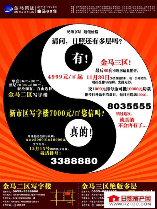 请问,日照还有多层吗?有!金马三区,最后80套准现房清盘销售,4999元/㎡起,11月30日为清盘销售日,统一公开销售,现接受排号抢购,先排先得,交1000元排号金可抵10000元房款,排号日开始至清盘日,每日再送您100元,机会不容错过,欢迎品鉴!