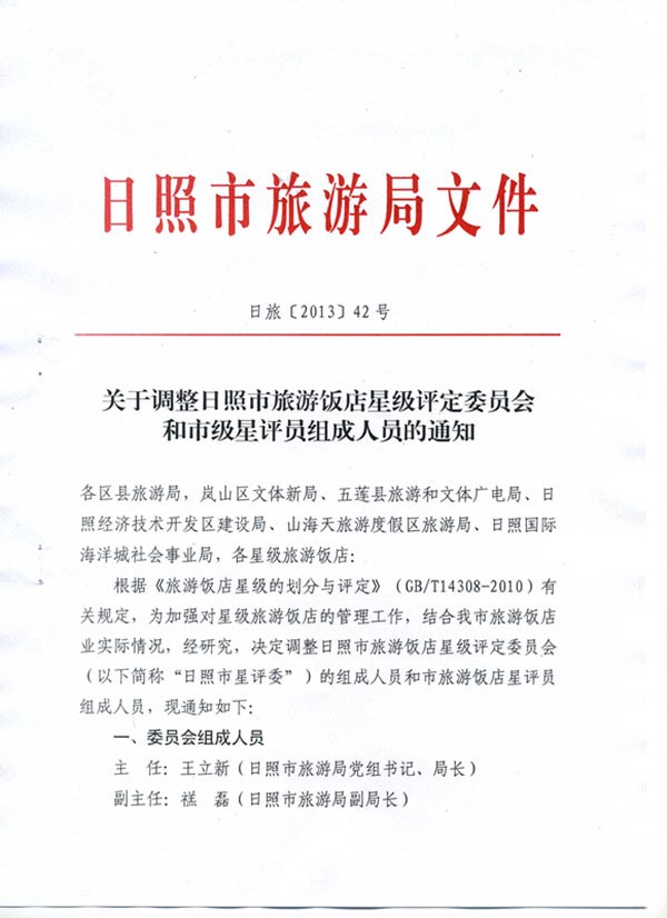 关于调整日照市旅游饭店星级评定委员会和市级星评员组成人员的通知(2013年11月08日)