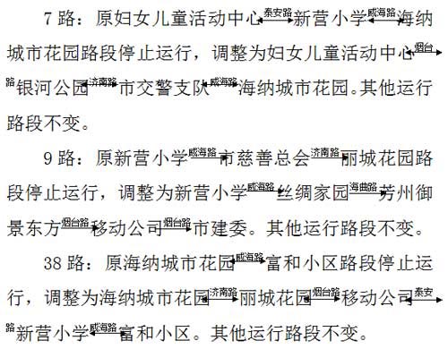 记者从日照市公交公司获悉,12月13日起,威海路与淄博路路口施工,将致使威海路(泰安路~济南路段)公交车辆无法正常通行,途经该路段的7路、9路、38路临时绕行。 据了解,自施工之日(12月13日)起,将途经该路段的7路、9路、38路临时绕行济南路、烟台路、泰安路,待施工结束后再恢复原线路运行。现将调整路线公布如下: 调整路线 提醒广大市民注意出行线路,避免造成不必要的麻烦。
