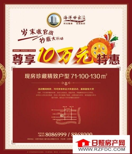 海洋世家三期——岁末收官战,抄底大行动,尊享10万元特惠!现房珍藏精致户型71-100-130㎡,时光随意,生活由你! 活动期间购房,均可参加幸运大转盘活动,赢取超级大奖!