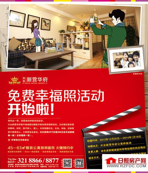 12月20日起,兴业新营华府携手港城婚纱摄影开展免费幸福照活动,为你留住幸福的瞬间。携手家人、爱人,共享温馨时光,化妆、场地、设备等都不需要担心,只需要报名参加,就能获得20寸价值388元法式油画相框一副(幸福照一张)。