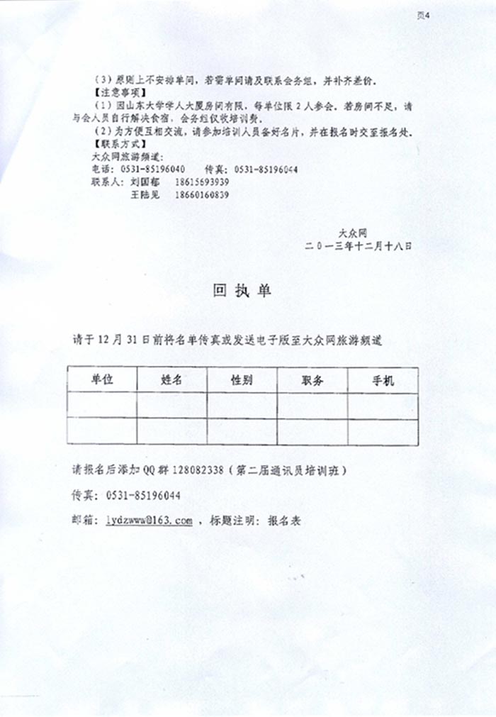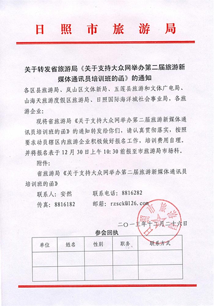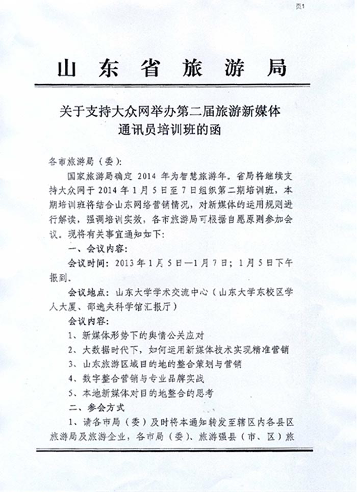 关于转发省旅游局《关于支持大众网举办第二届旅游新媒体通讯员培训班的函》的通知(2013年12月26日)