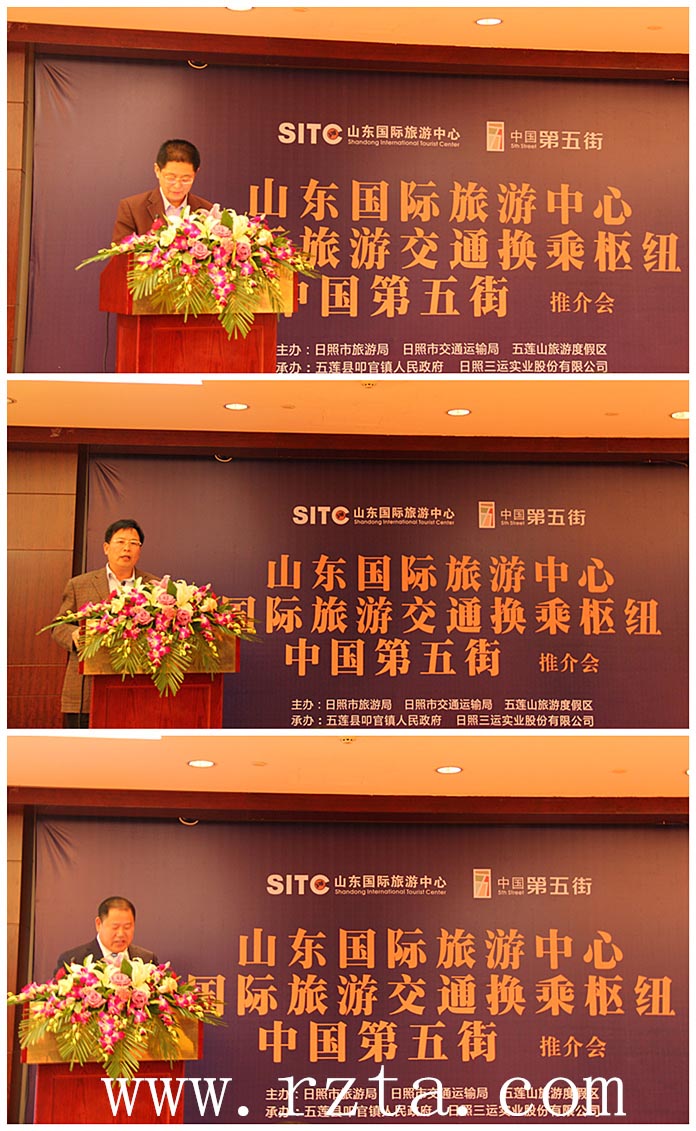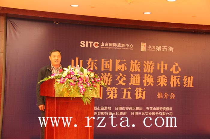 12月28日上午11时, 山东国际旅游中心·国际旅游交通换乘枢纽暨中国第五街推介会于岚桥锦江举行,本次推介会由日照市旅游局、日照市交通运输局、五莲县人民政府主办,五莲山风景区管理委员会、叩官县人民政府、日照三运实业股份有限公司承办。日照市旅游局副局长赵志超及日照市交通运输局、五莲县人民政府等相关领导出席会议,并作致辞。