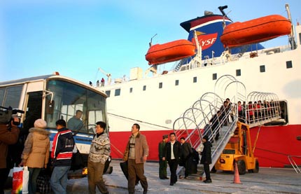 12月22日下午,由韩国平泽驶往我市的新型豪华客轮“彩虹号”首次在日照港安全靠岸,旅客走出船舱。随着我市对外开放步伐的加快和港口经济的发展,日照至平泽班轮航线的社会影响力不断扩展,知名度不断提升,客源迅速增加,原“旭日号”已不能满足正常需要。为此,韩国黄海轮渡株式会社投资2500万美元购置了新型豪华客轮“彩虹号”。