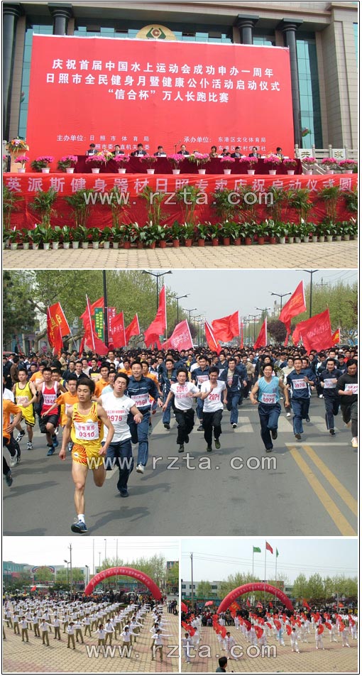 为庆祝我市成功审办首届水上运动会一周年,积极营造群众参与体育发展氛围。4月27日上午,由市体育局、市直机关工委、东港区人民政府联合举办,东港区文化体育局、东港区农村信用社共同承办日照市全民健身月暨健康公仆活动仪式“信合”杯万人长跑比赛开幕。 应邀出席启动仪式的领导有:市委副书记、市旅工委主任徐学武,市人大常委会副主任蔡建华,市政协秘书长李宗江,市纪委副书记高月康,市委副秘书长、市直机关工委书记何子安,市政府副秘书长黄秀芹,东港区区委副书记孔凡征,东港区副区长刘加宝。 活动在市委副书记徐学武的宣布下正式启动。体育局局长赵文胜主持启动仪式;东港区副区长刘家宝致辞;市委副秘书长、市直机关工委书记何子安宣读了山东省全民健身活动领导小组贺电;市委办公室督查室副主任章鲁宣读了活动倡议书。 市政府副秘书长黄秀芹为比赛发令,万人长跑拉开序幕。朝气蓬勃的运动员们都向前冲去。随后广场上的大型群众体育表演对万人长跑活动增添了气氛。 通过这次活动激发了全市人民参与水运会、支持水运会的巨大热情,营造良好的群众体育发展氛围,推动全民健身运动的开展,促进全市三个文明建设。以体育事业的发展,促进经济社会的协调发展,为“水上运动之都“做出积极的贡献。
