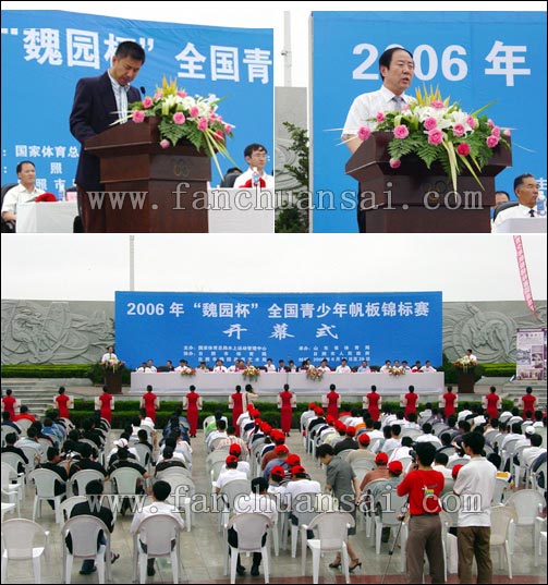 6月19日,由国家体育总局水上运动管理中心主办、山东省体育局和日照市人民政府共同承办的“魏园杯”2006全国青少年帆板锦标赛在日照万平口演艺广场隆重开幕。 出席开幕式的领导有组委会执行主任、国家体育总局水上运动管理中心副主任、中国帆板运动协会秘书长李全海;国家体育总局水上运动管理中心一部副部长、中国帆船帆板运动协会副秘书长周长城;组委会副主任、山东省体育局综合业务处副处长谈文新;日照市人大常委会副主任蔡建华;组委会执行主任、日照市副市长解世增;日照市政协副主荆建迎;中共日照市纪律检查委员会副书记唐仕泉;日照军分区副政委李清云;组委会副主任、日照市政府秘书长黄秀芹。开幕式由日照市体育局局长赵文胜主持。 组委会执行主任、日照市副市长解世增在致欢迎词中说:“在国家体育总局、山东省体育局的正确领导下,‘魏园杯’2006全国青少年帆板锦标赛开幕了!我谨代表中共日照市委、日照市人民政府和280万日照市民,向前来出席开幕式的各位领导、各位来宾各位朋友,向全体运动员、教练员、裁判员表示热烈的欢迎!向长期以来给与日照关心支持的各级领导和社会各界朋友致以诚挚的谢意”。同时指出日照拥有世界领先的水上运动基地,特别适合开展各类水上赛事活动。这次全国青少年帆板锦标赛是今年重要的水上运动赛事之一,对推动我国的帆船、帆板运动的更快发展,促进日照“水上运动之都”建设,有着极其重要的意义。并预祝比赛圆满结束。 组委会副主任、山东省体育局综合业务处副处长谈文新在致辞中讲到:“这次全国青少年帆板锦标赛在日照举办,充分体现了国家体育总局对山东、对日照的支持与厚爱。我们将和日照市政府一道以这次比赛为契机,努力提高工作水平,为我国帆板运动的普及与提高,为建设大而美、富而强的社会主义新山东做出积极贡献。 组委会执行主任、国家体育总局水上运动管理中心副主任、中国帆板运动协会秘书长李全海在讲话中说:“日照市一座美丽的海滨城市,具备开展水上运动的良好条件,2006年国际470级帆船世界锦标赛在日照举行,也是国家水上运动基地和2008年奥运会帆船帆板赛前指定训练基地。2007年首届中国水上运动会也将在日照举行,这将进一步推动日照“水上运动之都”建设,加快我国水上运动的跨越发展。并预祝比赛圆满成功、日照早日成为世界知名的“水上运动之都”! 此次比赛于6月16日至6月26日进行,历时10天,也是广大游客来日照旅游,现场观看全国青少年帆板锦标赛比赛的好机会。