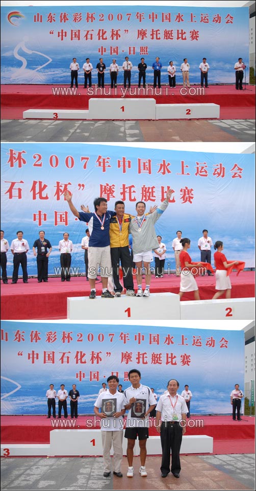 2007年中国水上运动会摩托艇比赛,经过两天的激烈角逐,8月30日下午比赛圆满结束。 山东队夺得两枚金牌,分别是女子OSY-400级环圈竞速赛和女子坐式水上摩托障碍赛,获奖选手为:丁亚男和曲甜娜。广东深圳天荣队同样获得二金,其中王元超夺得男子坐式水上摩托障碍赛的冠军,朱平康夺得男子立式水上摩托竞速赛的冠军。O:350级环圈竞速赛的冠军被湖北队的岳涛收入囊中,O:250级环圈竞速赛的冠军得主是湖南队的史海文,男子OSY-400级环圈竞速赛的冠军得主是安徽队的张典春。江西队的赵路怡获得女子水上摩托竞速赛的冠军。男子坐式水上摩托竞速赛的冠军由上海划船俱乐部的倪浩军夺得,女子坐式水上摩托竞速赛的金牌则由武汉体院队的李倩倩取得。
