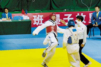 赵林在比赛中(左一) 9月11日,在滕州举行的十一运会男子跆拳道80公斤级比赛中,我市运动员赵林不畏强手,顽强拼搏,勇夺金牌,实现了日照在全运会上的历史性突破。 在上午举行的第一轮比赛中,赵林即遭遇河北运动员王广帅的强有力挑战,经过三局艰苦的争夺,最后以8:7的比分战胜对手,涉险过关。接下来的比赛中,赵林愈战愈勇,先后以3:2和2:1的比分分别战胜辽宁队的李生和解放军队的朱国,最后杀进决赛。在决赛中,赵林更是经受了严峻的考验,在前三局打成平手的情况下,通过加时赛艰难战胜了浙江运动员王皓,夺得了这枚含金量极高的金牌。这枚金牌也是我市在历届全运会上夺得的首枚金牌,开创了我市竞技体育的里程碑。