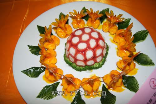 比赛过程中,各参赛选手拿出看家本领,展示自己别具匠心的创意作品。现场有用南瓜雕刻的太公垂钓,有用萝卜雕刻的海底戏浪,也有用两个西瓜镂空雕刻的水上宫灯……原本其貌不扬的瓜果、萝卜、香芋等食品,在参赛选手的巧手下,竟变成了形态各异的具有美学价值的艺术品。肥硕的海参,碧绿的青葱,再配上乳白色的象拔蚌,让人垂涎欲滴。冷菜拼盘里,大师杂技般的手法和鬼斧神工般的刀法将让大家体验到中国烹饪的神奇艺术效果。一道道色、香、味、型俱佳的美味菜品,在灯光下泛出诱人的光泽,赢得了在场观众的一阵阵喝彩。
