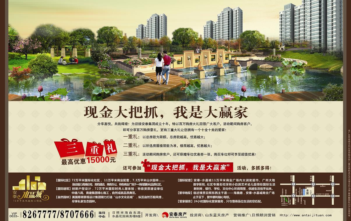 分享喜悦,共铸辉煌!为迎接安泰集团成立十年,特以百万购房大礼回馈广大客户,活动期间购房客户,即可分享百万购房豪礼,更有三重大礼让您拥有一个十全十美的爱家! 一重礼:以总房款为限额,总房款越高,优惠越大; 二重礼:以所选房屋楼层数为准,楼层越高,优惠越大; 三重礼:活动期间购房客户,还可获赠车位优惠券一张,购买车位即可享受超值优惠! 还可参加“现金大把抓,我是大赢家”活动,多抓多得!