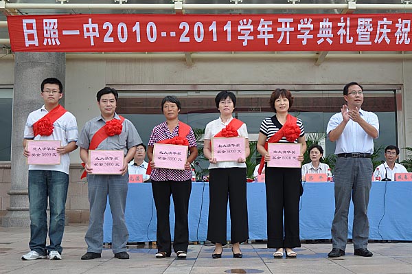 9月10日下午,“日照一中2010-2011学年开学典礼暨庆祝教师节大会”在东校区综合楼前广场上隆重举行。集团总裁许光应邀出席了此次典礼并为考取北大清华的学生及学生家长颁发北大清华奖金。北大清华奖是我集团在日照一中和实验高中设立的奖学金项目,奖励范围是该校考取北京大学、清华大学的学生。北大清华奖的设立,是我集团回报社会的长久举措,为日照的教育事业贡献力量。