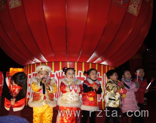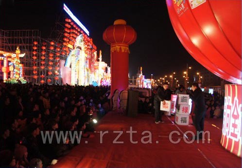 为配合做好全市元宵灯会工作和“好客山东、多彩日照”贺年会收尾工作,满足人们的精神文化需求和祈福求祉的愿望,增强元宵佳节欢乐祥和的氛围,日照市旅游局在第一展区市政府广场中心位置搭起了16米×16米的大舞台,扎起了直径12米的大灯笼,每天19:00开始“抢福”游戏,从2月15日起到18日止,共4晚5场,为好客山东贺年会增光添彩的同时,为市民和游客献上新年浓浓的祝福。
