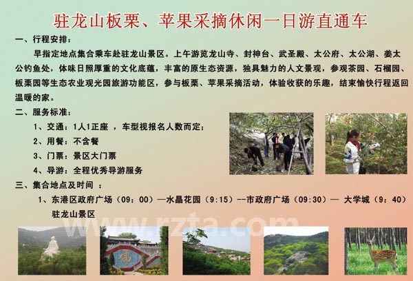 活动期间,凡购票进入景区的游客,在游玩的同时可亲自体验采摘板栗(限 1斤)。 为此,驻龙山风景区将结合市内各大旅行社在老城区、石臼、新市区开通直通车,组织驻龙山板栗采摘休闲一日游。在大学城开通大学城至驻龙山景区的直通车。收取打包价格20元/人(包含门票、车费、车上导游讲解、景区保险等)。