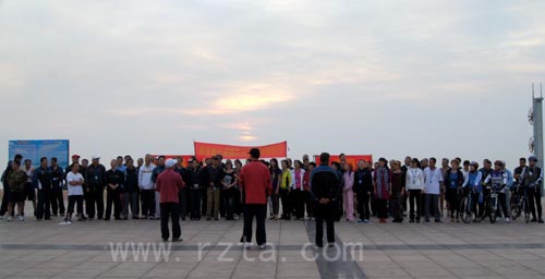 大海扬波旭日升,冬泳健儿迎国庆。9月25日六点,在金秋送爽、艳阳普照的早晨,日照市冬泳协会的全体会员和部分游泳爱好者齐聚在蓝天碧海金沙滩上,用游泳健身的特殊形式,庆祝中华人民共和国建国六十二岁生日。 同时还有数名冬泳协会的骑行爱好者,将在大海边启程,骑自行车去北京,到天安门广场参加国庆观礼活动。百人游泳庆国庆,众人骑车游北京。日照市冬泳协会会长朱云泉将8面袖珍国旗送给骑行队员,委托他们带到北京,插到天安门城楼上去,借以表达日照人民对祖国母亲的美好祝福。
