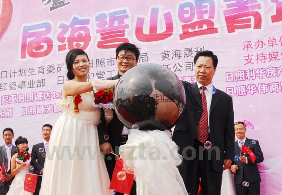 日照市人大常委副主席梁云爱出席婚礼庆典仪式活动并为新人证婚。市纪委党务副书记、监察局局长高月康,日照军分区参谋长郇敏、团市委书记袁利强市旅游局副局长禚磊和市文明办、市直机关工委等部门单位的分管领导参加了此次活动。苏浙皖豫的游客和日照市民等2万余人共同见证了隆重热烈的西式婚典。本次别开生面、时尚浪漫的集体婚礼,为假日的港城增添了一道喜庆的风景线。