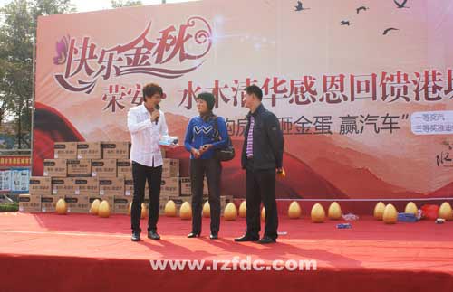 10月22日,荣安集团快乐金秋系列顾客回馈活动在东港区政府广场举行,凡在水木清华购置房产的客户均可报名参与砸金蛋赢大奖的活动,荣安集团为广大客户准备了精美丰厚的大奖,一等奖汽车,二等奖海尔冰箱,三等奖雅迪电动车,四等奖微波炉。更有各种精美的小礼品奉送给积极参与活动的广大市民。