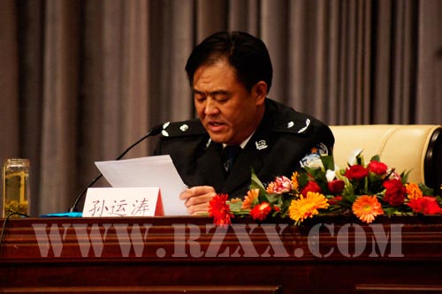 日照市公安局副局长孙运涛发表讲话,他表示,公安机关将大力加强保安队伍专业化建设,充分调动和发挥保安服务组织的辅助作用,积极推进维护稳定体系建设、参与社会治安综合治理,全力维护社会治安稳定。