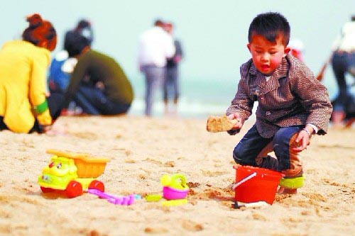 4月8日,游客在万平口生态公园海边游玩。 当日是周末,气温持续回升,人们纷纷走出家门,来到海边游玩,在日光下享受大海沙滩带来的快乐。