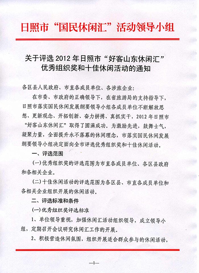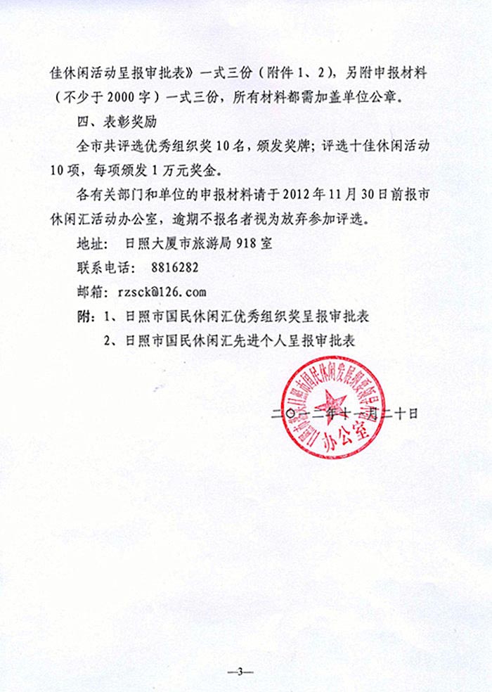 关于评选2012年日照市“好客山东休闲汇”优秀组织奖和十佳休闲活动的通知(2012年11月22日)