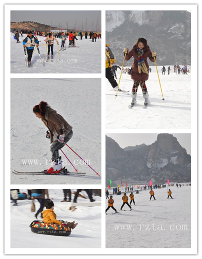 五莲山滑雪场位于五莲山风景区西北侧,北邻白鹤湖,南邻杜鹃山庄,西邻五莲山中路,由日照市飞天旅游开发有限公司投资3000万元兴建经营,滑雪场占地面积15万平方米,其中造雪面积近4万平方米,滑雪场设有入口大门、停车场、管理中心、儿童道、初级道、中级道、高级道、摩毯、拖牵、雪地摩托及滑圈等。