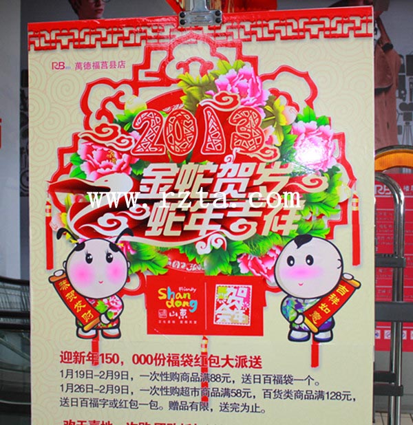 另外在各楼层悬挂了以“好客山东贺年会”主题元素为主的吊旗,包括店内的POP、DM快报、促销版面等宣传品,均设计制作了“好客山东贺年会”主题宣传形象。