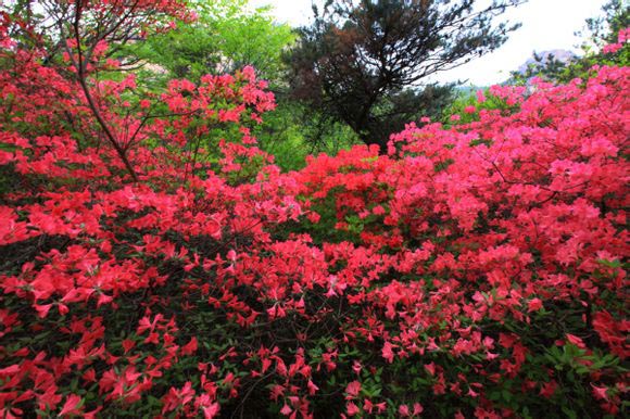 五莲山旅游风景区是江北最大的野生杜鹃花栖息地,有蓝瑾、映山红、照山白等三大品系,四十多个品种,主要分布在五莲山南苑花园、九仙山黑牛场花园和九仙山靴石花园,面积达1300多公顷,以其品种多、花期长、面积大、分布广等特点冠绝华北。每年4月20日-5月20日盛花时节,各品系杜鹃花陆续开放,登高处,青山绿水间,一团团一簇簇,开得热烈、绚丽,或殷红似火,或高雅富贵,或淡著缟素,如诗如画,美不胜收,令人流连忘返。