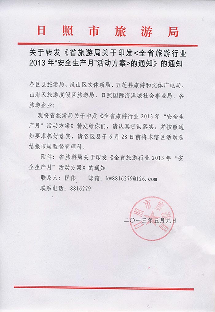 关于转发省旅游局关于印发《全省旅游行业2013年“安全生产月”活动方案》的通知的通知(2013年05月09日)