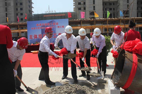 2013年5月13日上午,在轰鸣的礼炮声中,华润置地(日照)有限公司总经理、华润中心项目总经理、南通华新建工集团董事长等高层领导以及业主代表,共同启动了封顶仪式,见证了这一激动人心的时刻,伴随着最后一方混凝土的浇筑到位,由南通华新建工集团承建的华润中心•凯旋门一期10#、11#、12#、13#结构主体全部封顶。