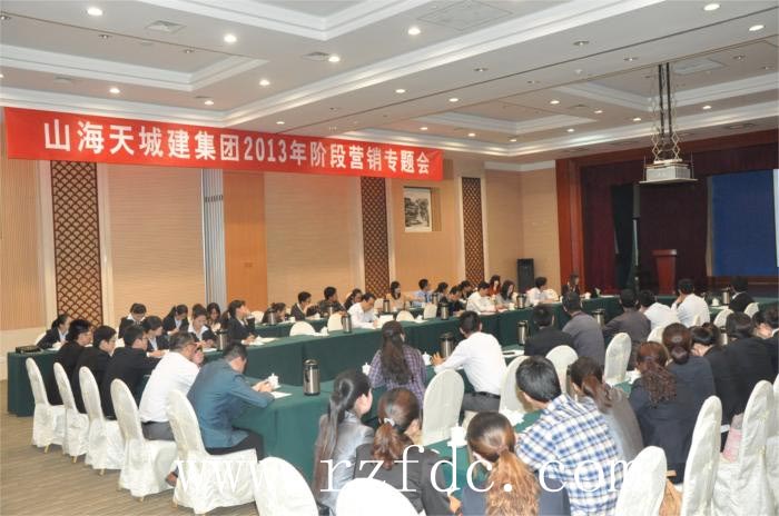 5月15日下午,山海天城建集团阶段营销专题会在金海花园大酒店举行。集团总裁许光、常务副总裁张汝良、总裁助理孙勇等领导出席会议,营销服务中心、各项目公司、客户服务中心、物业公司等50多名相关人员参加了此次营销会。此次营销会旨在对2013年1—4月份的营销情况进行总结,并对下一步工作计划进行讨论。会议上,营销服务中心王新伟做《1—4月份营销分析总结》、营销服务中心副总经理王辉做《各项目目标分解》报告及营销服务中心戴金丽做了《电商工作总结》报告。