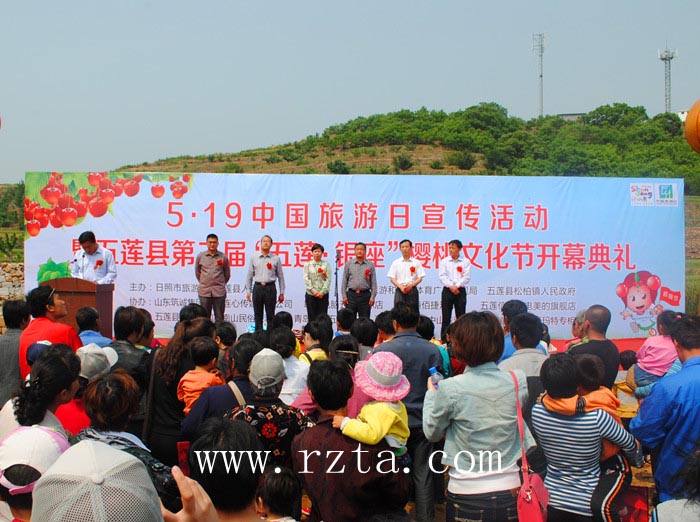 5月19日上午,以“爱旅游•爱生活”和“休闲惠民•美丽中国”为主题的5.19中国旅游日宣传活动暨2013五莲县第三届樱桃文化节在松柏镇刘家南山民俗旅游村樱桃采摘区盛大开幕。日照市旅游局副局长赵志超,五莲县人民政府副县长赵荣芬等领导出席开幕式,五莲县县委宣传部副部长、县旅游和文体广电局局长单忠元主持开幕式。