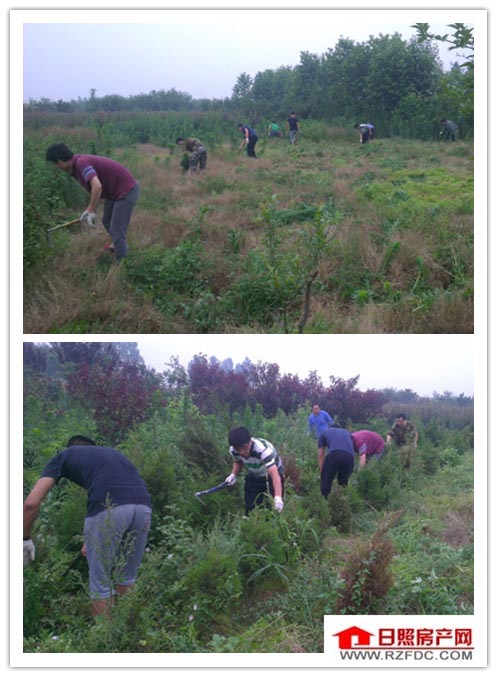 上午9点,全体员工到达牟家小庄项目部所在地,一场阵雨也给这次义务劳动带来了一个凉爽的好天气,经过了简单休整并认真听取了项目部人员讲解的一些安全事项,大家就斗志昂扬的投入了义务劳动之中,男员工们按照事先的分组安排,进入了事先分好的场地内,这些场地既有一人多高的苗木区,也有布满荆棘的松柏地,在公司几位男副总的带领下,大家克服困难,挥舞着镰刀,经过了近十个小时的努力,终于将几十亩的荒芜地整理的干干净净。男员工们干的热火朝天,“半边天”们也不肯落后,在完成给苹果树套膜的任务后,她们又不停歇的又投入到给青苗除杂草的劳动中。