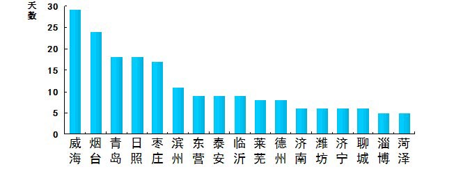 7月份,“蓝天白云,繁星闪烁”天数最多的城市是威海,为29天,最少的城市是淄博和菏泽,均为5天。
