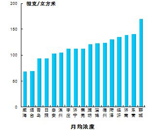 7月份,可吸入颗粒物浓度最好的城市是威海,为68μg/m3,最差的城市是聊城,为169μg/m3;同比恶化幅度最小的城市是菏泽,为-2.4%,恶化幅度最大的城市是青岛,为-64.9%。