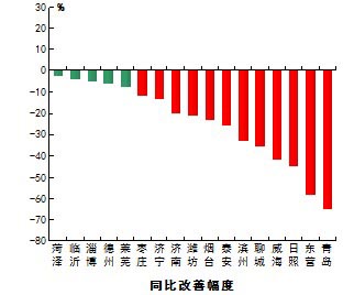 7月份,二氧化硫浓度最好的城市是烟台,为15μg/m3,最差的城市是淄博,为66μg/m3;同比改善幅度最大的城市是聊城,为48.6%,同比恶化幅度最大的城市是青岛,为-52.0%。