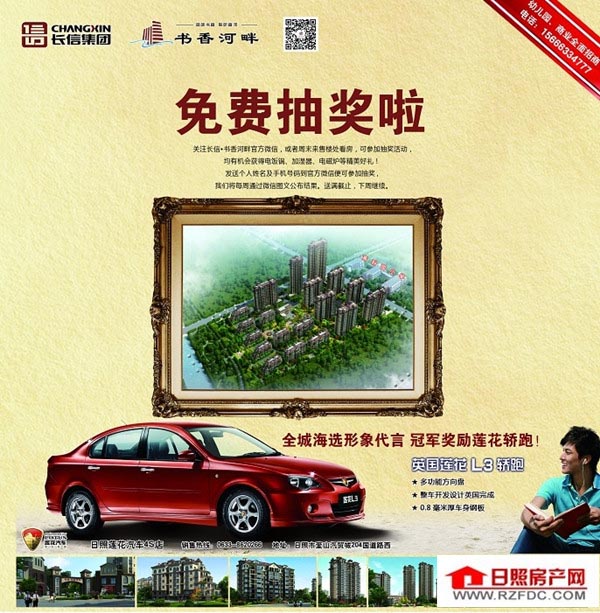 关注长信·书香河畔官方微信,或者周末来售楼处看房,可参加抽奖活动。均有机会获得电饭锅、加湿器、电磁炉等精美好礼!发送个人姓名及手机号码到官方微信便可参加抽奖,长信·书香河畔 将每周通过微信图文公布结果,送满截止,下周继续。 长信·书香河畔全城海选形象代言,冠军奖励莲花轿跑。 相关链接: 长信·书香河畔位于日照市昭阳路369号(与潍坊路交会处),西邻香店河,东邻高科园小学,环境优美,教育资源优越。由高层、小高层、多层、洋房和一栋6班幼儿园组成,项目东邻高科园的小学,西侧紧临香店河,70-92㎡中小户型,轻轻松松安个家。