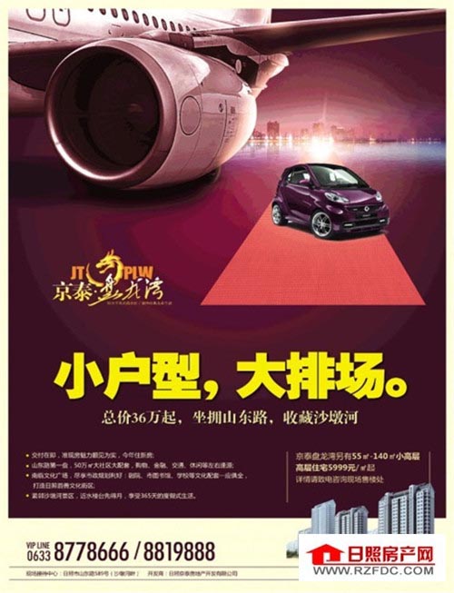 京泰·盘龙湾,小户型,大排场。总价36万起,坐拥山东路,收藏沙墩河。另有小高层、高层住宅5999元/m²起,详情请咨询售楼处。 相关链接: 京泰·盘龙湾,位于山东路589号(沙墩河畔),占地面积212亩,是一个总建筑面积50万平方米的生态大盘。项目容积率2.49,绿地率40%,建筑密度22%,是迄今我市最大的房地产开发项目之一,项目建成后将形成集托幼、休闲、娱乐、居住为一体的高尚住宅区。 项目位于山东路与菏泽路交汇处,日照南北交通大动脉临沂路东,山东路是贯穿日照新老市区的中心主干道,东可到达海滨,西可至同三高速,交通便捷。 日照房产网为您带来京泰·盘龙湾购房热线:0633-8778666 8819888