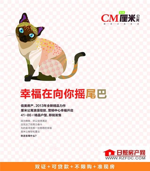 厘米公寓,幸福在向您摇尾巴!信美房产,2013年全新精品力作,厘米公寓浪漫绽放,营销中心幸福开启。41-86㎡精品户型,即刻发售,欢迎品鉴!