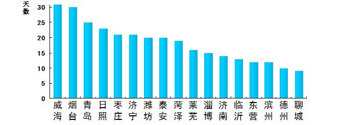 8月份,“蓝天白云,繁星闪烁”天数最多的城市是威海,为31天,最少的城市是聊城,为9天。