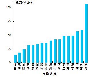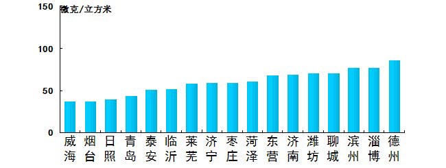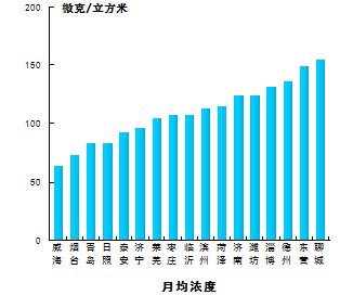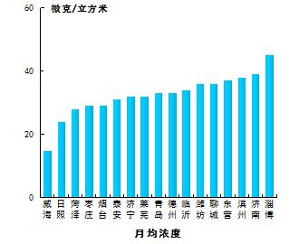 8月份,细颗粒物浓度最好的城市是威海,为37μg/m3,最差的城市是德州,为86μg/m3。