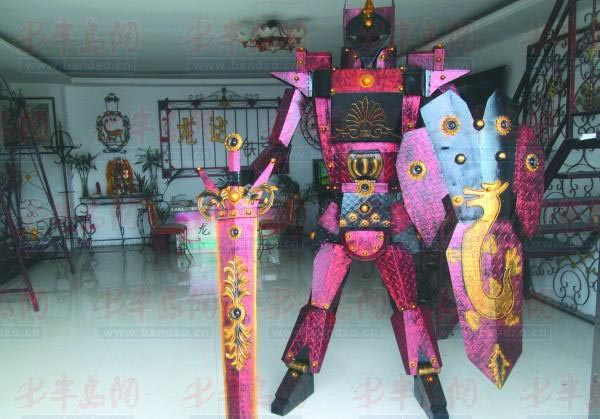 9月23日,莒县铁艺工人陈洪武用废铁造出的“变形金刚”完成了最后一遍刷漆,正式亮相。这个钢铁战士,重300余斤,高2.3米,是他从收购的上千斤废铁中选出的材料制成的,整个制作过程耗时一个月。因为前几天他把没有完工的框架发到了网上,所以现在已经有不少人等着和这个大块头合影。 千斤废铁造出钢铁战士 今年 38岁的陈洪武告诉记者 ,他从十年前开始从事铁艺行业 ,工作之余,他就喜欢鼓捣一些钢铁做成的工艺品。一次偶然的机会看到南方有人做出钢铁战士,他看着非常漂亮,于是就想自己做一个,但是当时条件有限 ,所以一直没能付诸行动。近年来《变形金刚》系列电影的上映,他做钢铁战士的想法又冒了出来,从去年开始就非常注意收集废铁。今年春节过后,他把莒县十几个大型的废品收购站跑了个遍,只要是觉得能用在钢铁战士身上的他都会买来,然后堆在车间里。总共收集了一千多斤废铁,他用这些废铁造出了高2.3米重300余斤的钢铁人。整个制作过程耗时一个月,21日整体框架完工,今天涂了 5遍漆,才算正式完工。 破锅 、沙发腿成关键部位 23日记者见到了这个钢铁战士,只见他一手持剑一手举盾,剑和盾牌上都有比较漂亮的图案,盾牌上还有一条龙的图案。陈洪武说,因为他是用收购的废铁造出的,所以很多部位不是很完美 ,尤其是肩、肘、膝等关节,没有比较好的材料去完成。钢铁人的脚部是用沙发腿做的,胯部实在找不到合适的材料,他就用了一个破锅,没想到做出来效果非常好。说起制作这个钢铁人的过程,陈洪武说一个月前他在网上看到一张照片非常漂亮,于是就想照着照片做一个。可是做起来的时候却发现比较麻烦,不是这个地方不对,就是那个地方不符,主要原因就是缺少零配件 ,所以经常是拆了重装。而且他有自己的工作,先要忙活客户定做的东西。只能在空闲时间或者晚上去做,这个过程中好几次都要放弃了 ,因为做起来实在是太难。 不少网友想来合影 21日,陈洪武将自己还没有喷漆的钢铁战士发到了网上,虽然看上去不是很精美,也比较粗糙,但还是受到了网民的好评,很多人都在网上给他留言,询问在什么地方,想过来合影、拍照。陈洪武说等刷上漆之后,就会摆在自己铁艺店门口,供人们欣赏。“这只是一个试验品,下一步我想做一个更加精美的。”陈洪武说,因为自己现在做的这一个,很多地方不完美 ,没有恰当的配件去完成。所以下一步他打算准备一些更加合适的材料,做出一个更加精美的。虽然花了上千元和一个多月的工夫去制作钢铁战士,但是陈洪武觉得值,因为他爱好这个。