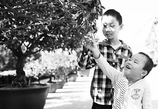 10月5日,小游人与桂花树亲密接触。国庆期间,日照市第二届桂花展在莒县陵阳镇陵阳街村举行,整个村居成为一个巨大的桂花园,免费向游人开放。