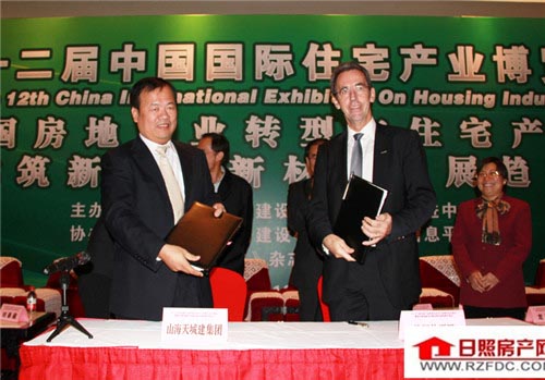 在住博会上,山海天城建集团董事长相丰会见了德国能源署总裁斯蒂芬•科勒先生,并与斯蒂芬•科勒先生签署了《日照被动式低能耗建筑示范项目合作协议》。双方将在规划、设计与建造被动式低能耗建筑上展开战略合作。住房和城乡建设部住宅产业化促进中心主任杨榕、住房和城乡建设部住宅产业化促进中心项目合作处处长张小玲等住建部领导出席了签约仪式。