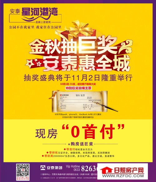 金秋抽巨奖,安泰惠全城,抽奖盛典将于11月2日隆重举行!10月1日-31日,成交客户赢取大奖,特别巨奖自填支票!另有苹果ipad4、iphone5S、MacBook等大奖可赢取,积极参与的客户每周可额外赢取惊喜奖品!