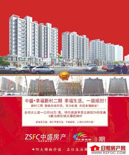 中盛幸福新村二期,幸福生活,一路顺封!新村二期,喜临全线封顶,实力彰显,共迎幸福新家! 全明大三居一口价58万/套,特价房源享受总房款2%的优惠,6套沿街旺铺火爆抢购中!