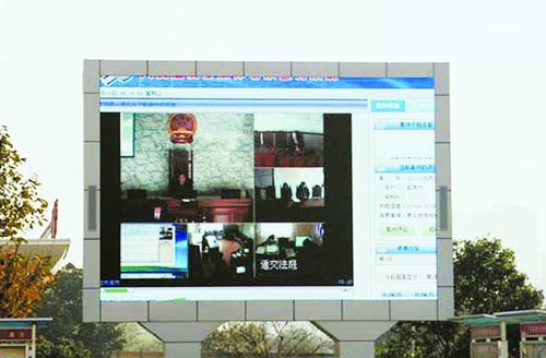 岚山区人民法院在审判综合楼前设置LED电子显示屏,集中展示法院工作动态、直播庭审等工作,使群众能够更直观地了解法院,感受到司法的公平正义。图为该院直播的一起道路交通事故案件庭审画面。