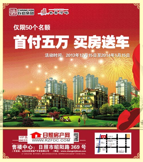 长信·书香河畔,首付五万,买房送车。仅限50个名额,活动时间:2013年12月15日至2014年1月15日。