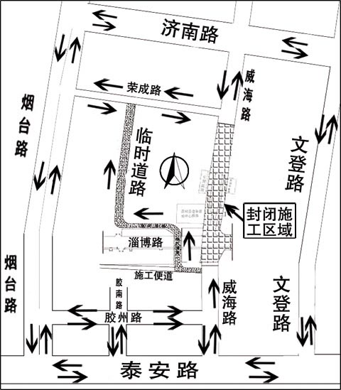 根据2013年城建计划安排,淄博路与威海路路口自2013年12月18日至2014年7月30日,实行全封闭施工。现将有关事项通告如下: 一、为方便群众出行,按照市政府安排,建设单位在封闭区域西侧修建临时道路。因临时道路较窄,为确保交通安全、畅通,社会车辆实行单向通行。威海路与淄博路路口以南自南向北行驶的社会车辆,可经临时道路--荣成路驶出。威海路与淄博路路口以北由北向南行驶的社会车辆,需绕行烟台路和文登路。 二、绕行路线附近中心商务区工程车辆,进入路线:沿威海路由南向北行驶至封闭路段时向西驶入施工便道。驶出路线:沿临时道路驶入荣成路。 三、胶州路自胶南路至威海路段实行单向通行,车辆只能自西向东行驶。 四、施工结束后,该区域交通按新的方案组织。 特此通告。 日照市住房和城乡规划建设委员会 日照市公安局交通警察支队 二○一三年十二月十二日
