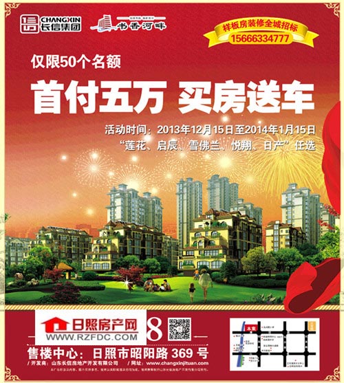 房子有了,车还远吗?长信·书香河畔喜迎新年,自2013年12月15日至2014年1月15日,买房送车,首付五万!不论面积大小、不论楼层高低,不论多层与小高层,一律首付五万!雪佛兰赛欧、莲花L3、长安悦翔、启辰任您选!
