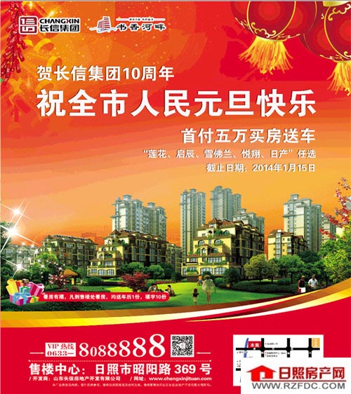 贺长信集团10周年,祝全市人民元旦快乐!买房送车,首付五万!不论面积大小、不论楼层高低,不论多层与小高层,一律首付五万!“莲花、启辰、雪佛兰、悦翔、日产任选”,截止日止为2014年1月15日,还在等什么,抢到就是赚到!