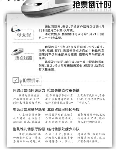 随着春节的临近,抢票大战大幕拉开。根据铁路部门现行车票预售期推算,今天起,旅客可通过网络和电话抢购腊月二十三小年(阳历1月23日)的火车票了。 1月23日是中国传统的农历“小年”,从往年情况看,从抢购这一天的车票起,春运购票高峰期正式拉开序幕。铁路部门表示,往年从小年到腊月二十八是旅客出行最为集中的一段时间。也就是说,从4日起到9日,将是今年春运抢票的第一个高峰。 据了解,今年铁路部门仍将采取错时放票的方式以缓解铁路12306售票网站瞬时的购票压力。其中北京西站发票时间为上午8点,北京站、北京北站发票时间是上午10点,北京南站发票时间是上午11点,所有动车、高铁车票的发票时间也是11点,旅客可按照不同车站投放票额的时间错时登录12306铁路订票网站或拨打电话订票,也可通过手机客户端购票。 若旅客到售票窗口或代售点购票,则需要将购票时间再顺延两天。 >>提醒 用抢票插件应明辨真伪 在2014春运票开售之际,抢票插件纷纷推出提前30天订票业务,并称抢票成功率比登录12306网站高出25倍之多。 不得不承认,抢票插件的出现对于传统网络购票模式而言,的确是次变革。很多旅客也都反映,通过插件抢票,省事又省心。但抢票插件与铁路售票官网间的一轮又一轮“屏蔽”与“反制”,直接受害者都是夹在中间左右为难的旅客。 从资金安全上考虑,建议旅客选择官网订票。如果旅客一定要选择抢票插件,尽可能选择“品牌”较大、“名声”较好的插件,不要相信网页上随机弹出来的抢票信息,以免造成财务损失。